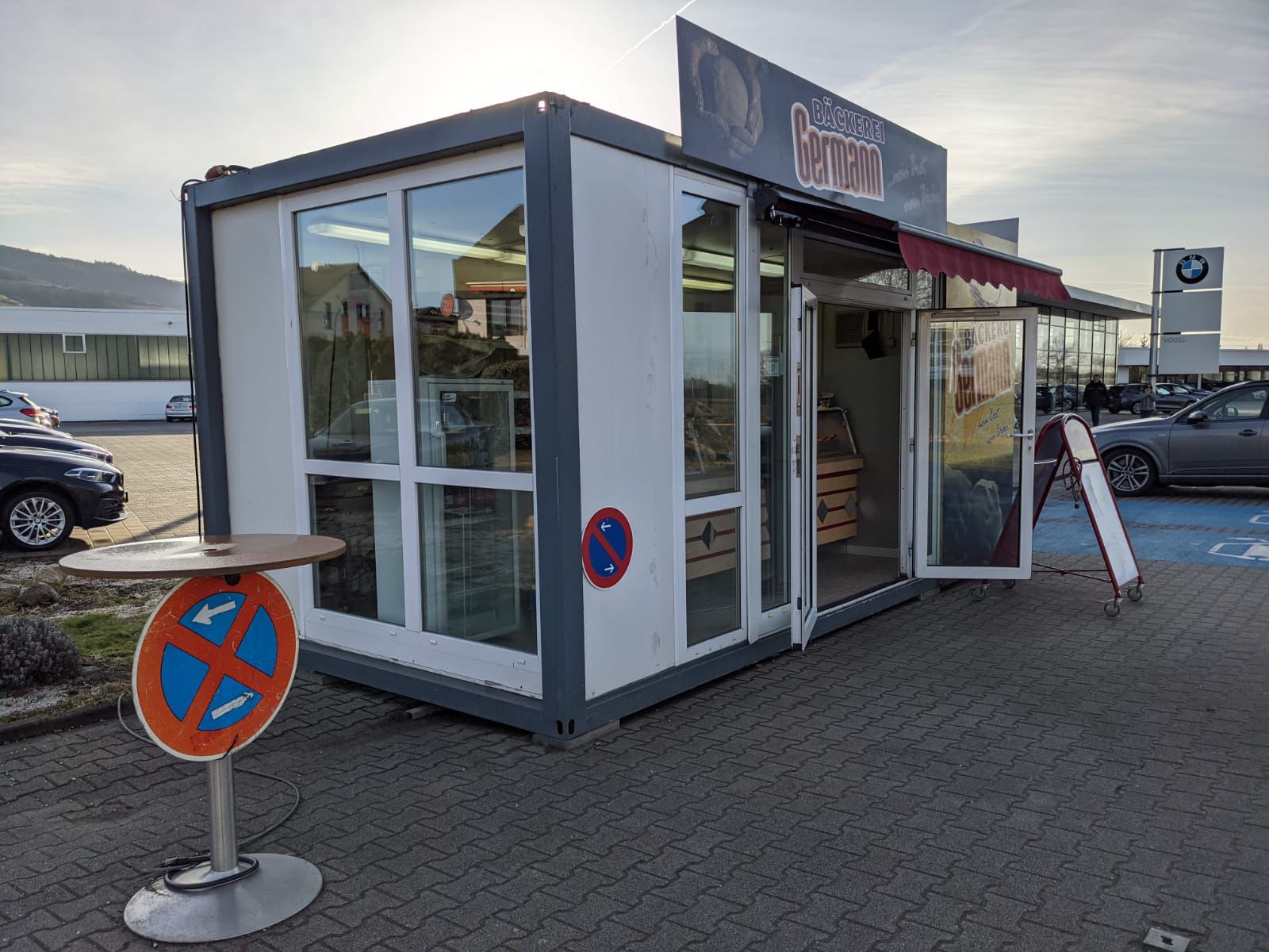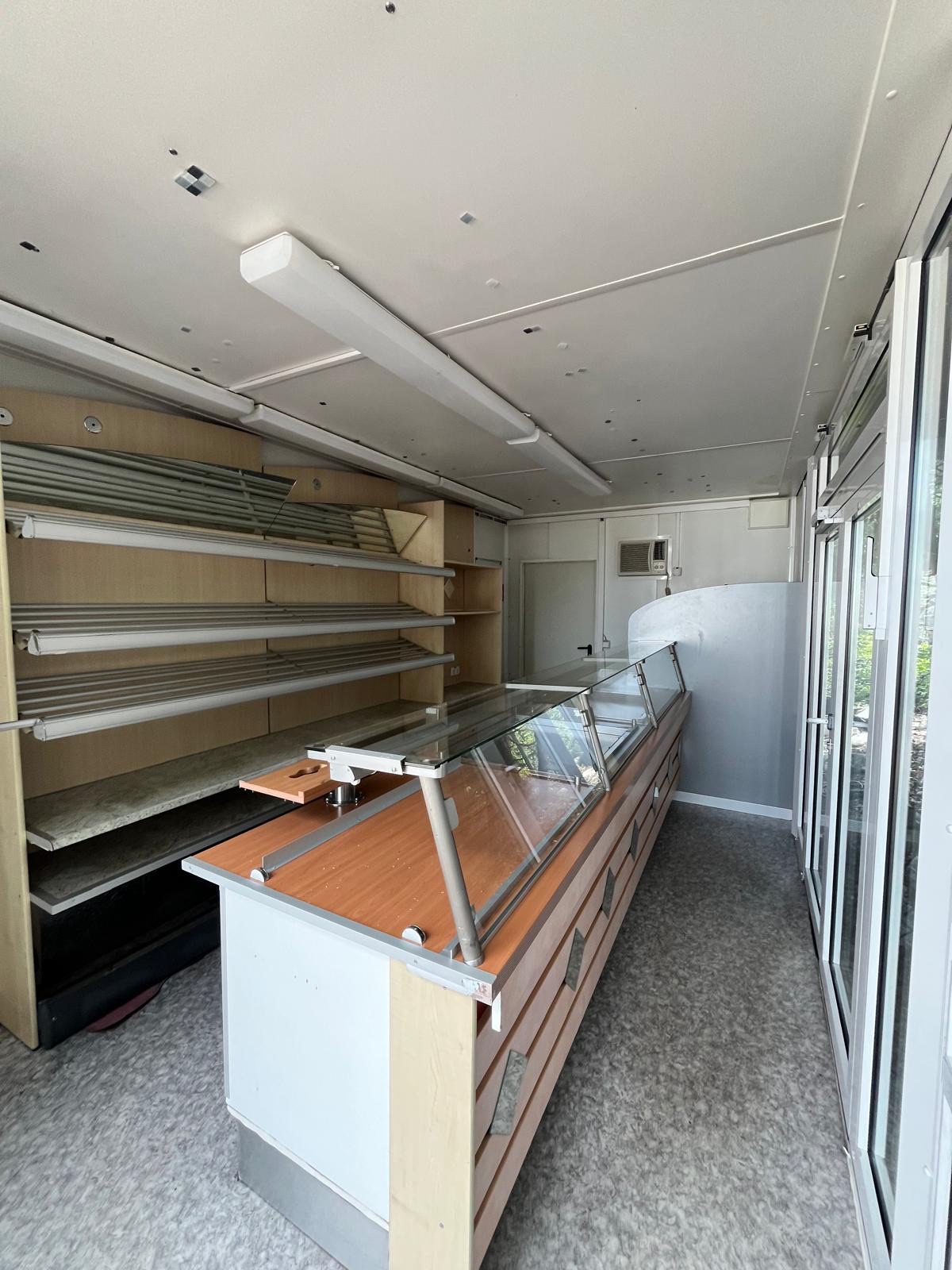 Vollständig ausgestattete Container mit Theke, Kühlung und Brotregalen – einfach aufstellen und loslegen.